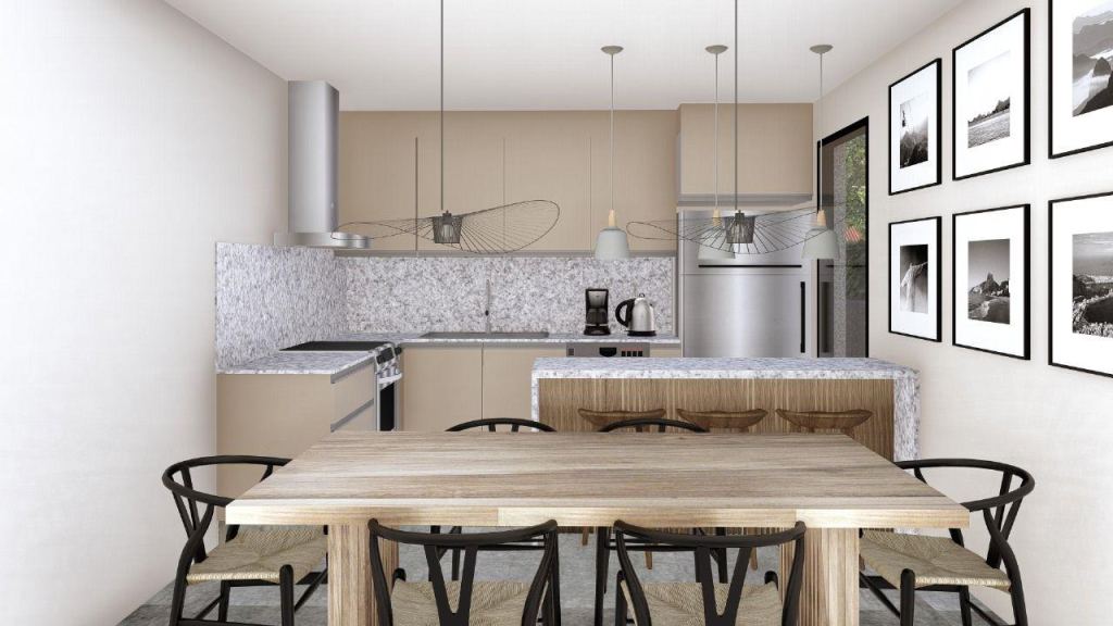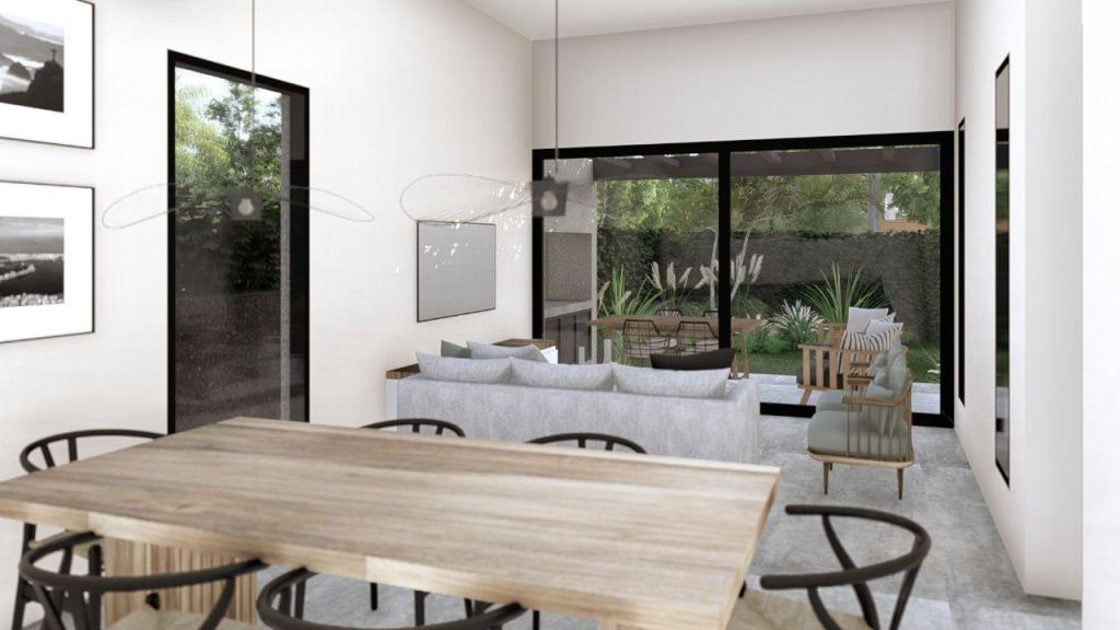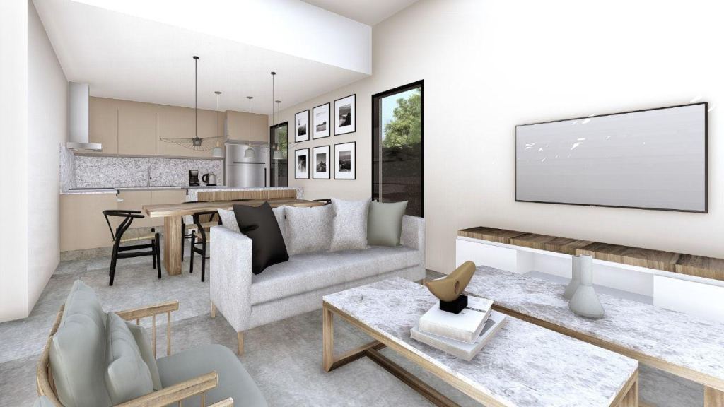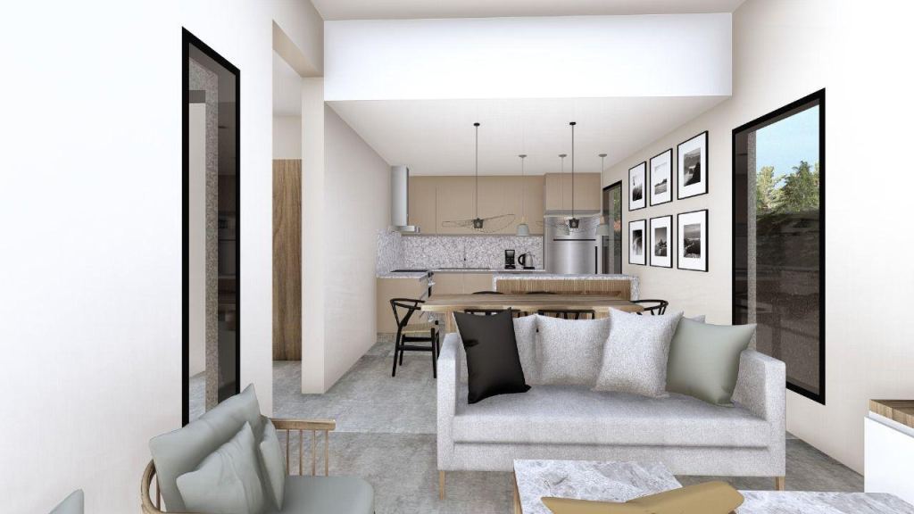 El área social ofrece un luminoso living-comedor integrado a la cocina, generando un ambiente amplio, cálido y moderno. La propiedad dispone de pisos de porcelanato y sistema de calefacción por losa radiante, brindando confort durante todo el año.
