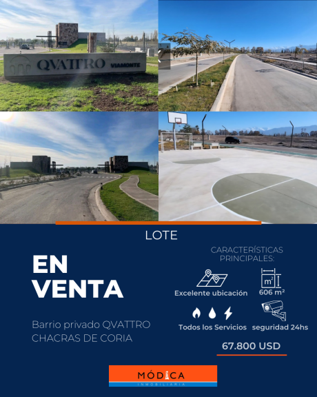 Lote de 602 m² en el exclusivo barrio privado Qvattro Viamonte, Chacras de Coria, Luján de Cuyo, Mendoza. Se encuentra ubicado frente a Bodega Viamonte ; a 2 minutos de Centro comercial Sobremonte y calle Almirante Brown; a 8 minutos de la Plaza de Chacras y a 20 minutos del Centro de la Ciudad.