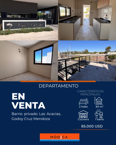 **Módica Inmobiliaria** se complace en presentar este **exclusivo departamento a estrenar**, ubicado en el prestigioso barrio privado Acacias de Godoy Cruz. Este inmueble, situado en el primer piso por escalera, es ideal para aquellos que buscan comodidad, seguridad y un entorno atractivo.