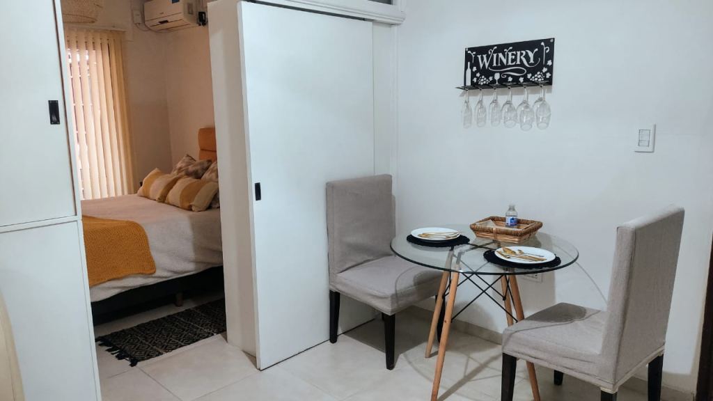 Tiene una sola habitación, cocina pequeña, patio privado, y baño nuevo.